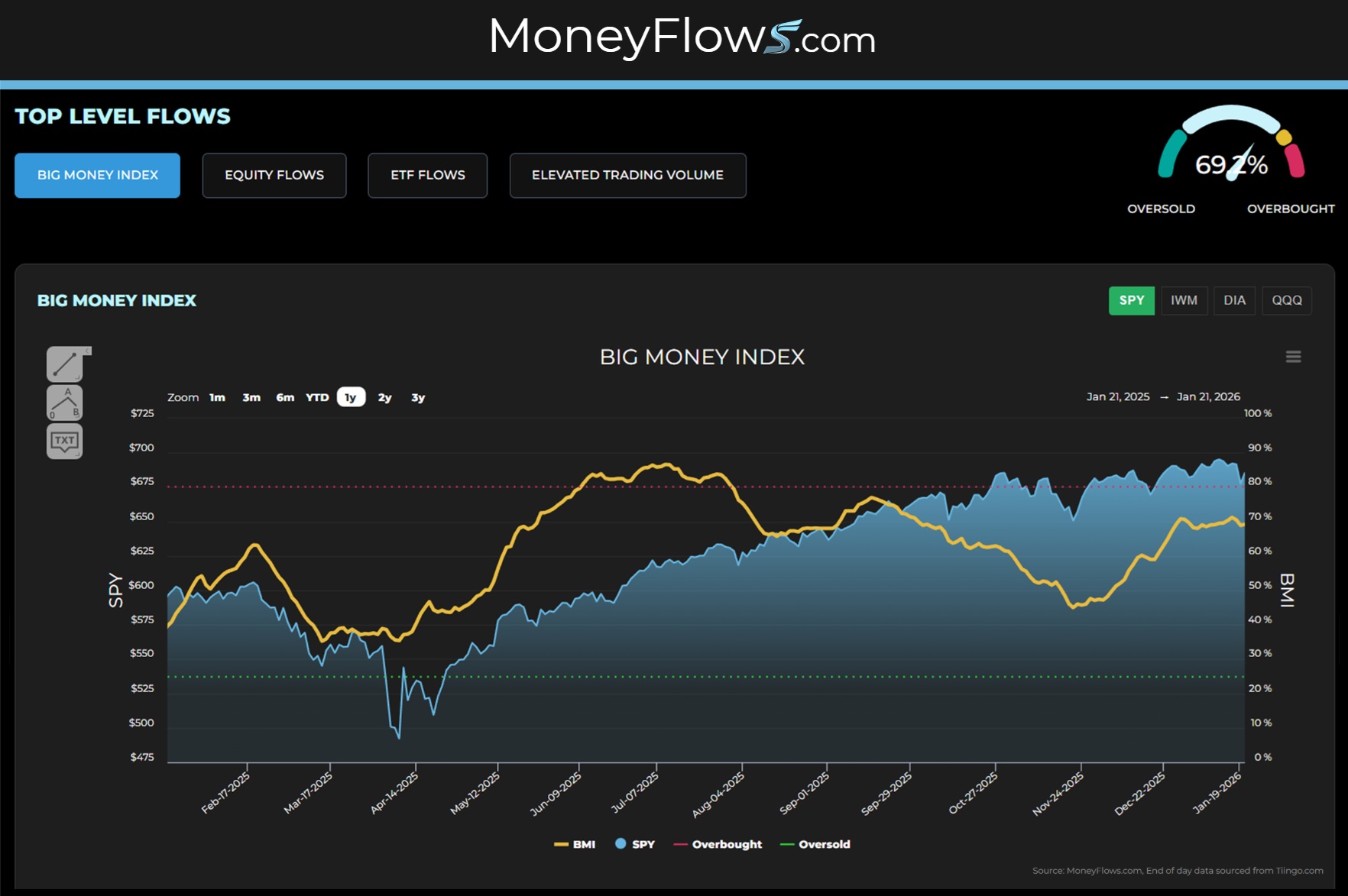 Our Big Money Index (BMI), which plots a moving average of all equity flows, is far from overbought (80% red line):