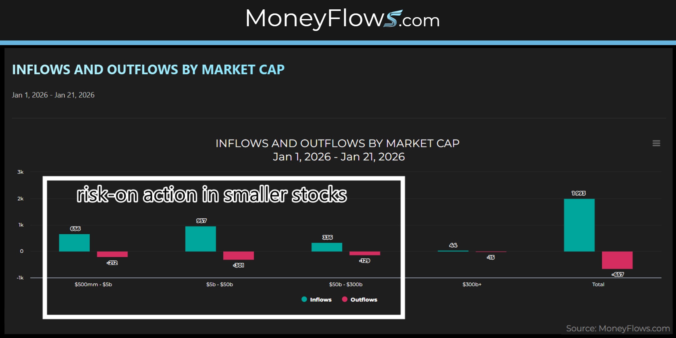 Notice how in 2026, nearly all inflows have been in companies with market-caps below $300 billion.