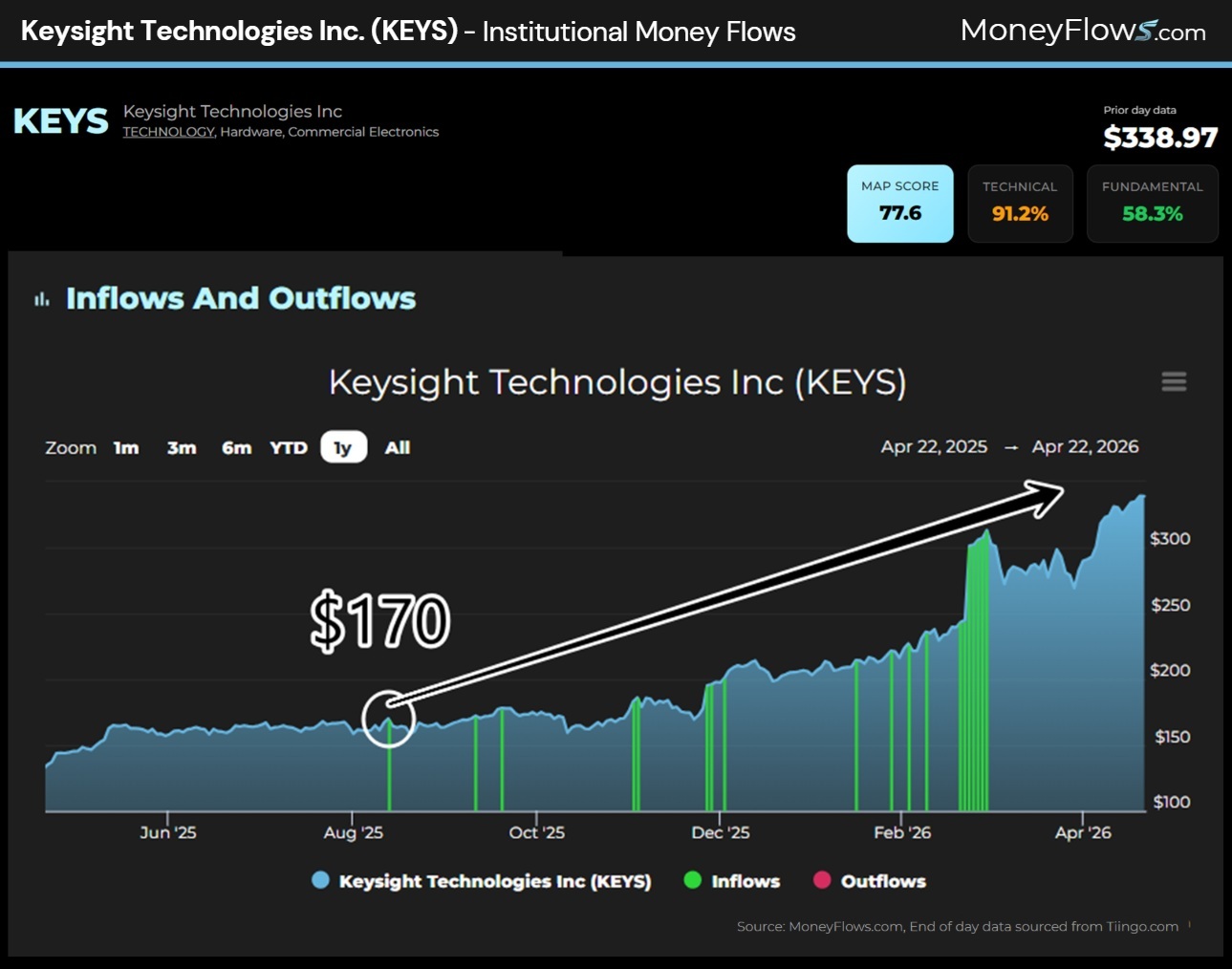A wall of inflows has pushed the stock up all year beginning at $170 per share. This is the predictive power of non-stop green inflows: