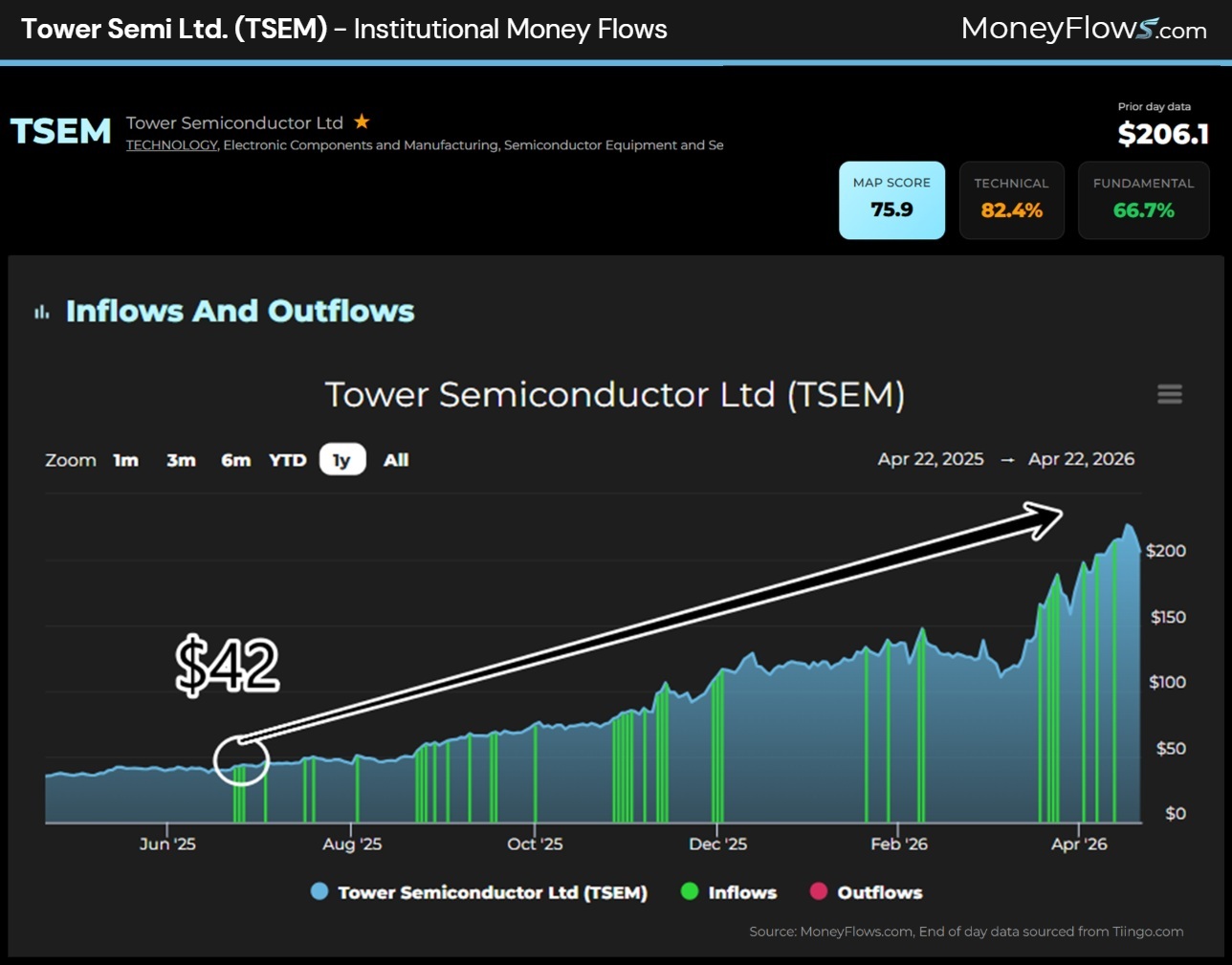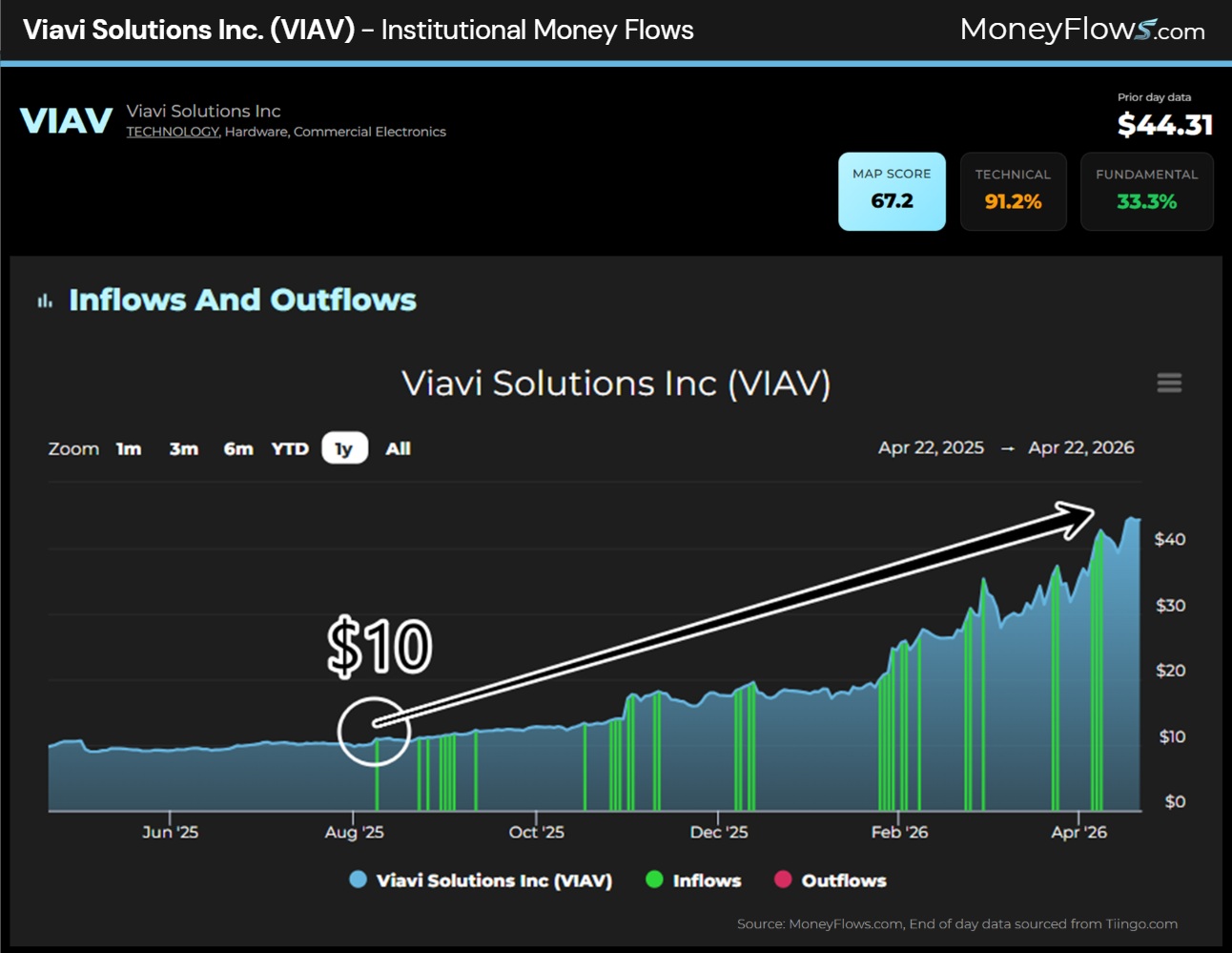 The share price has risen from $10 per share to over $44 since we first noted rare inflow signals.
