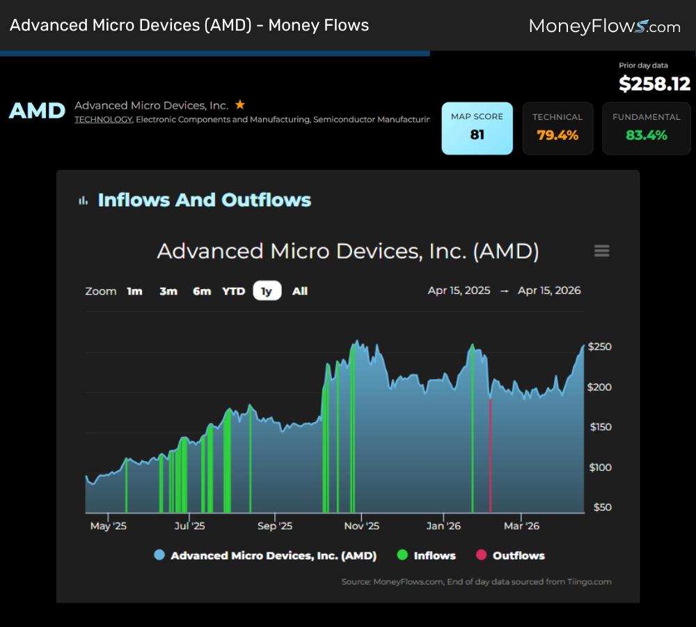 To help us see these hidden Big Money footprints, note the constant money pouring into AMD since last Summer.