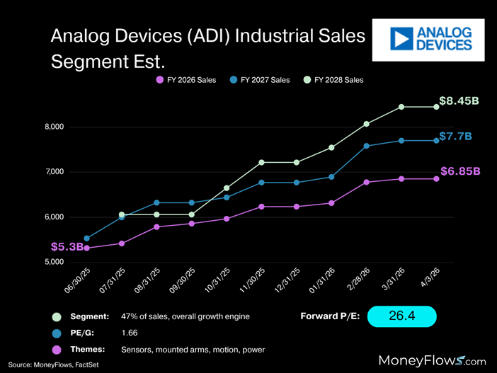 Below I’ve plotted ADI’s annual Industrial sales estimates. Wall Street continues to raise numbers with FY 2026 slated to come in at $6.85B.