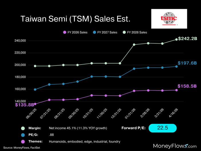 More importantly, Wall Street raised TSM’s revenue estimates through 2028. For FY 2028, sales expectations have now been revised higher to a whopping $242.2B.