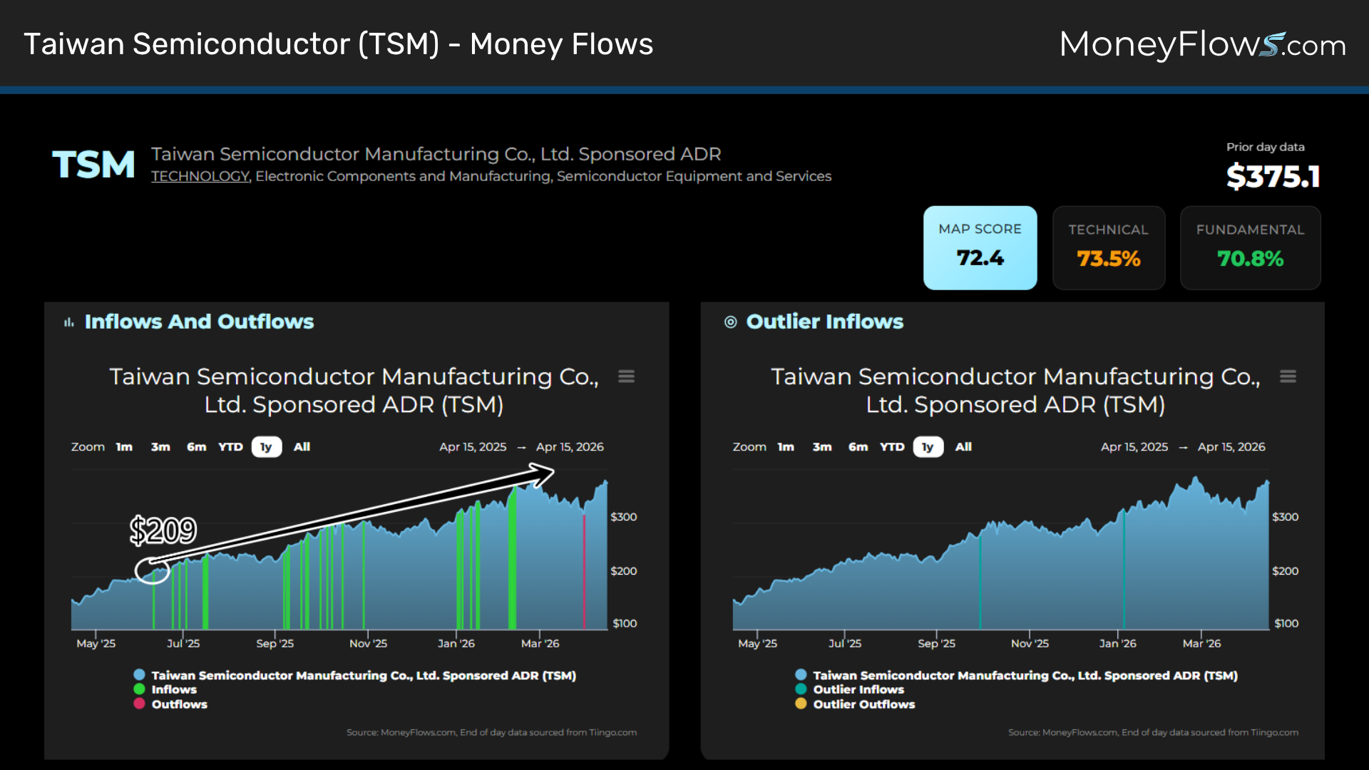 TSM shares have been under massive accumulation. In fact, it’s been a one-way train of green in our data for many months, beginning when the shares were $209.