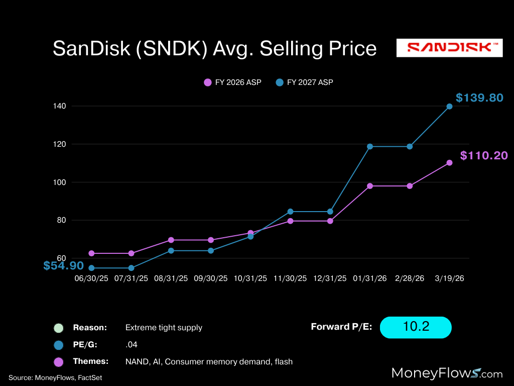 The number 2 storage and memory stock to own is SanDisk (SNDK). The $105B NAND flash developer has been on a stunning run lately.