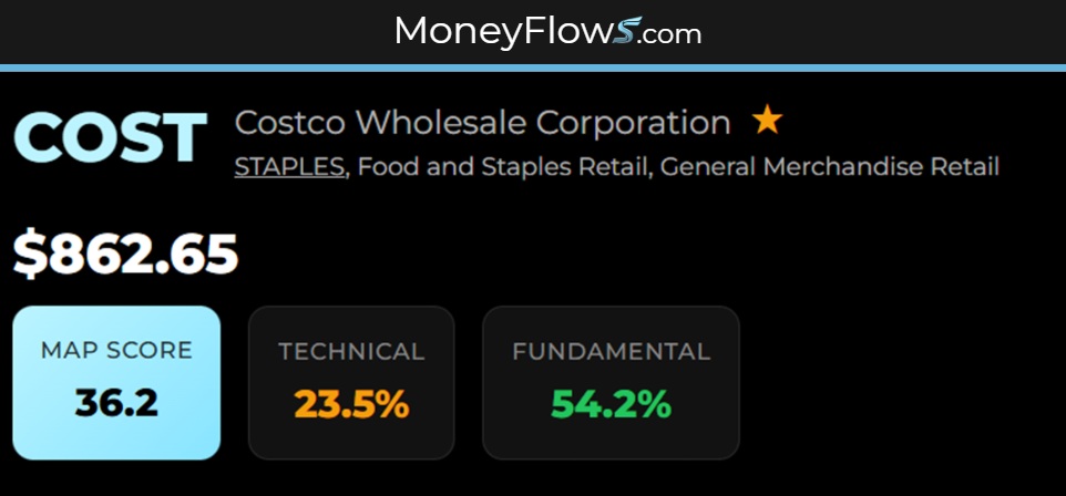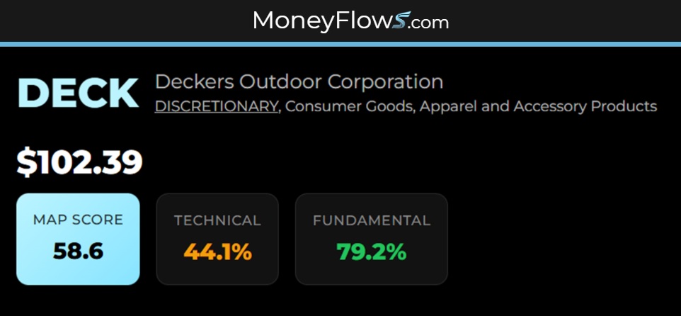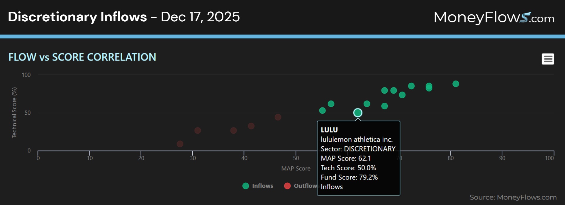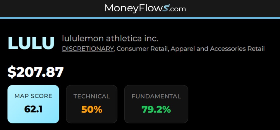 Notice through the MoneyFlows lens that LULU has an overall MAP Score of 62.1 which is broken down by a 50% technical score and rock-solid 79.2% fundamental score: