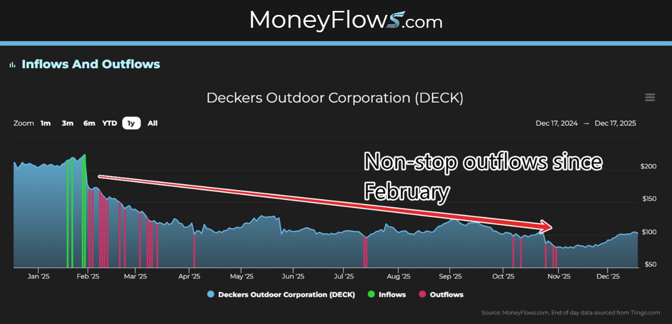 Like LULU, Deckers operates in the apparel space, disturbing footwear and accessories. They have popular brands such as HOKA and UGG.