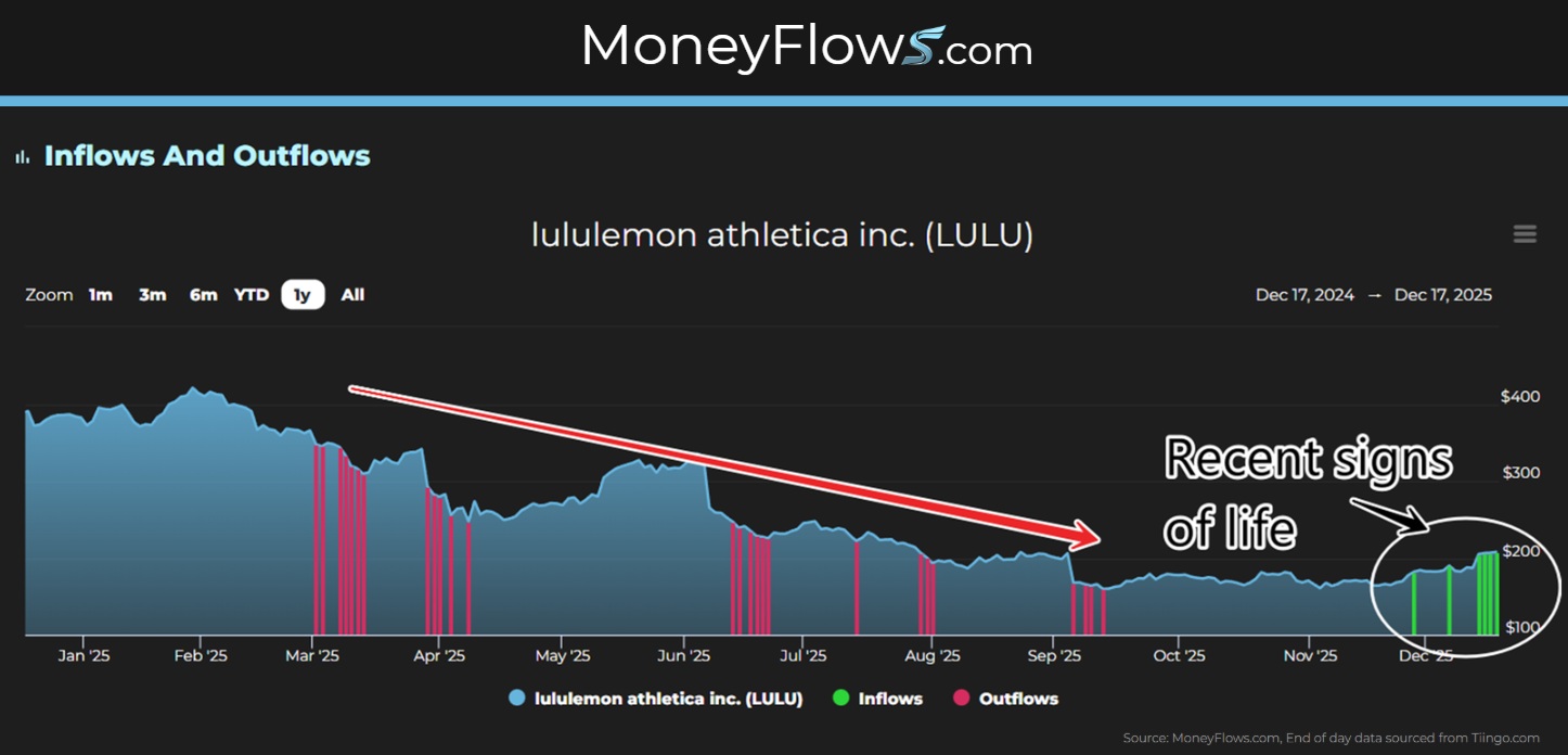 Interestingly, LULU saw an inflow yesterday (Disclosure: I own shares of LULU in a personal account):