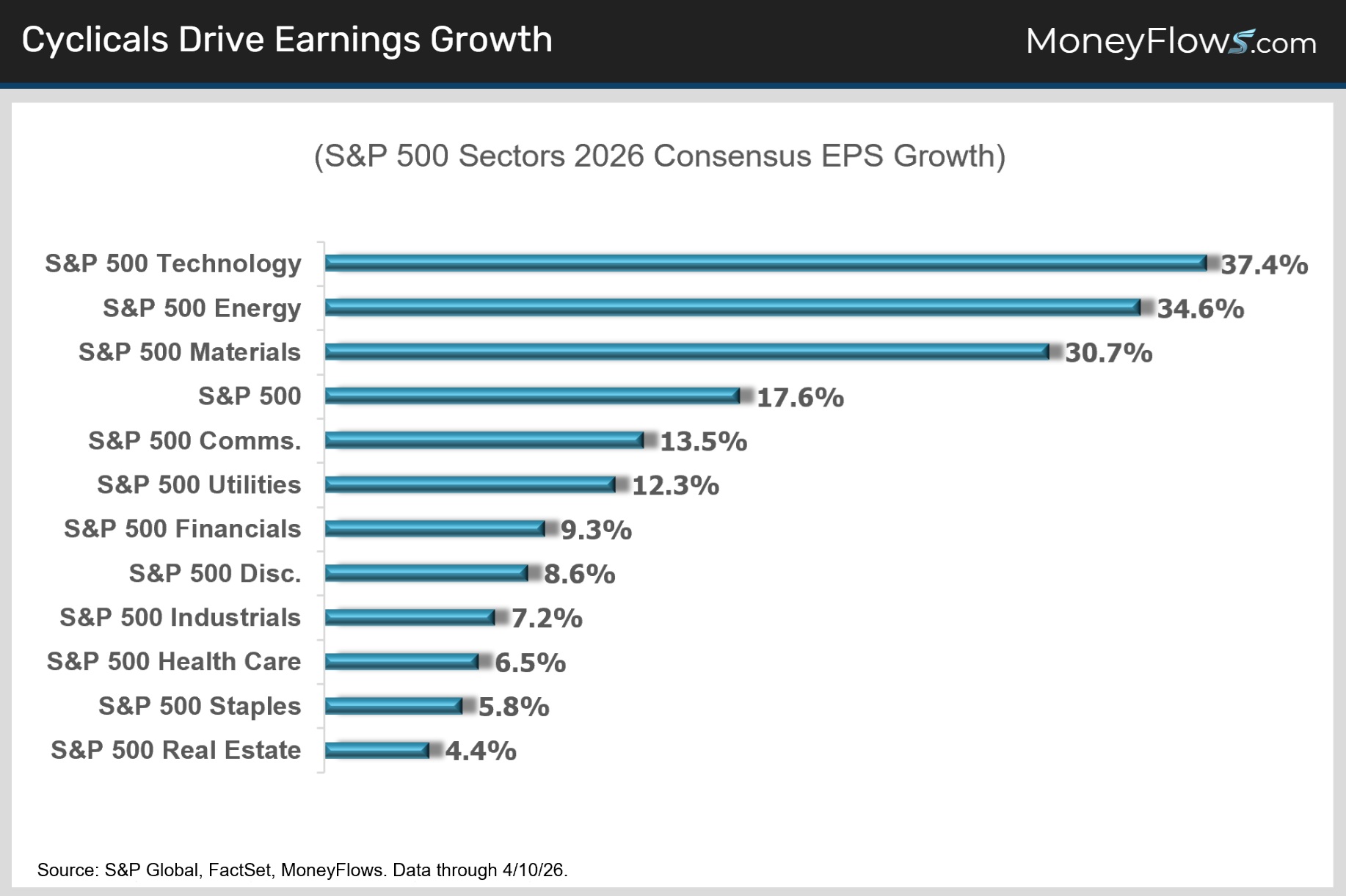 Remember that energy, materials and utilities, while doing very well, comprise less than 10% of the S&P combined, limiting their overall index level earnings impact.