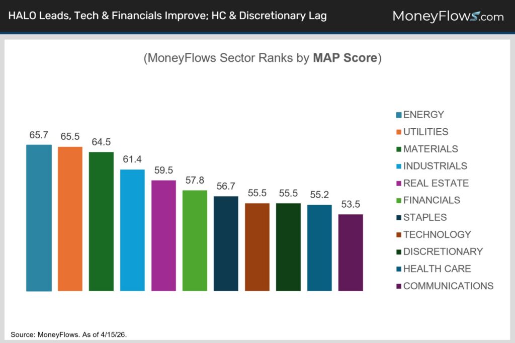 MoneyFlows sector rankings reflect this with HALO-heavy utilities, materials and industrials sectors leading while energy is still in the top spot but by a much narrower margin than in March (chart).