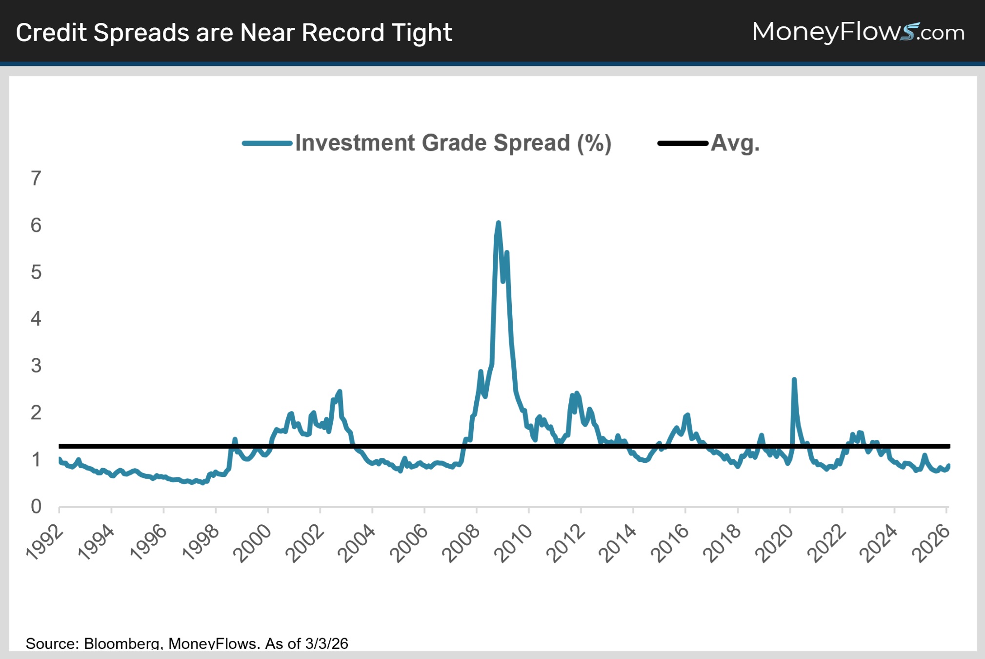 Spreads are currently near record-tight levels at only 88 basis points above Treasuries. That’s well below the long-term average of 130 basis points: