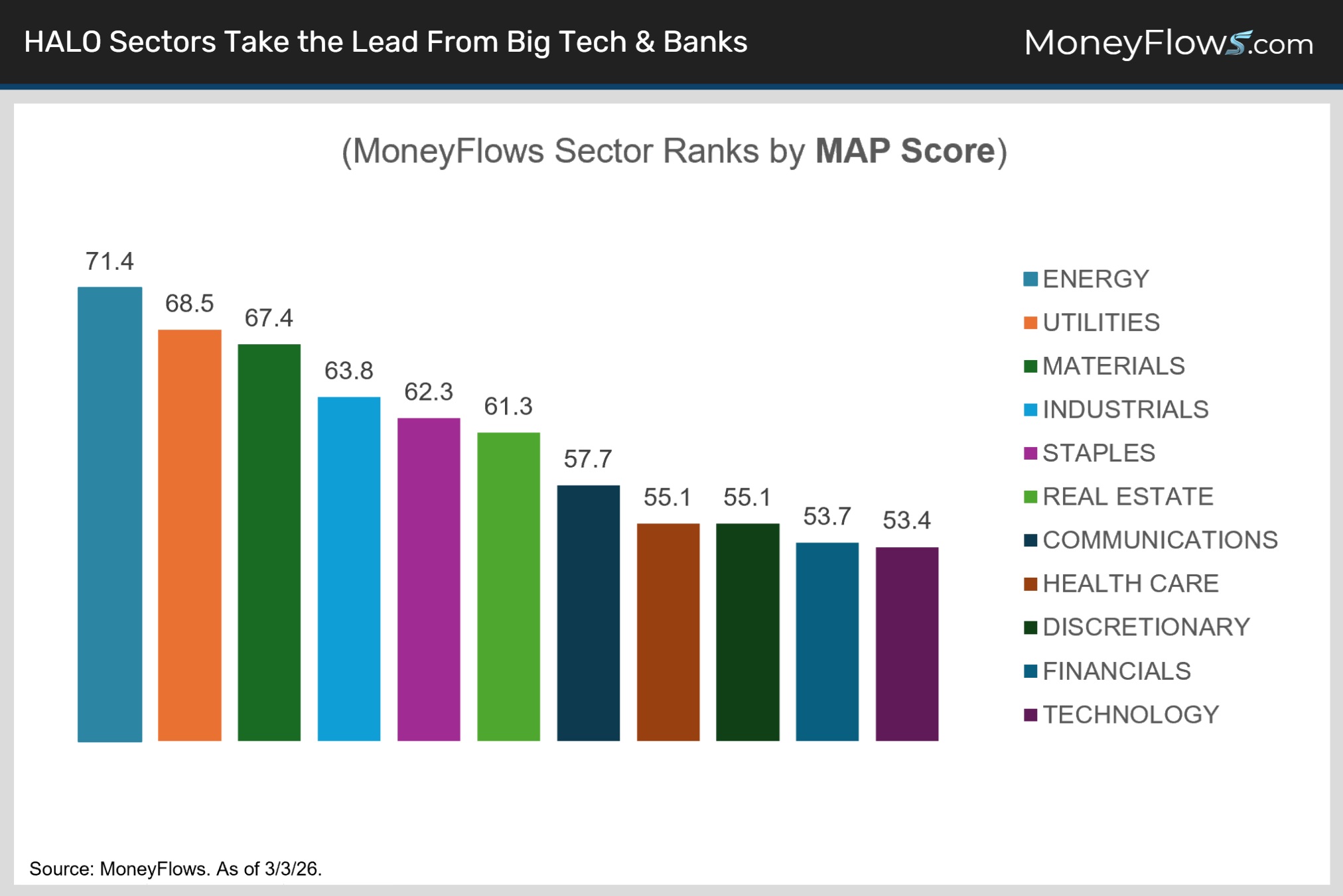 We’ve been recommending energy, materials, industrials and semis all year. They remain leadership. Safer defensives like utilities, staples and real estate are also outperforming.