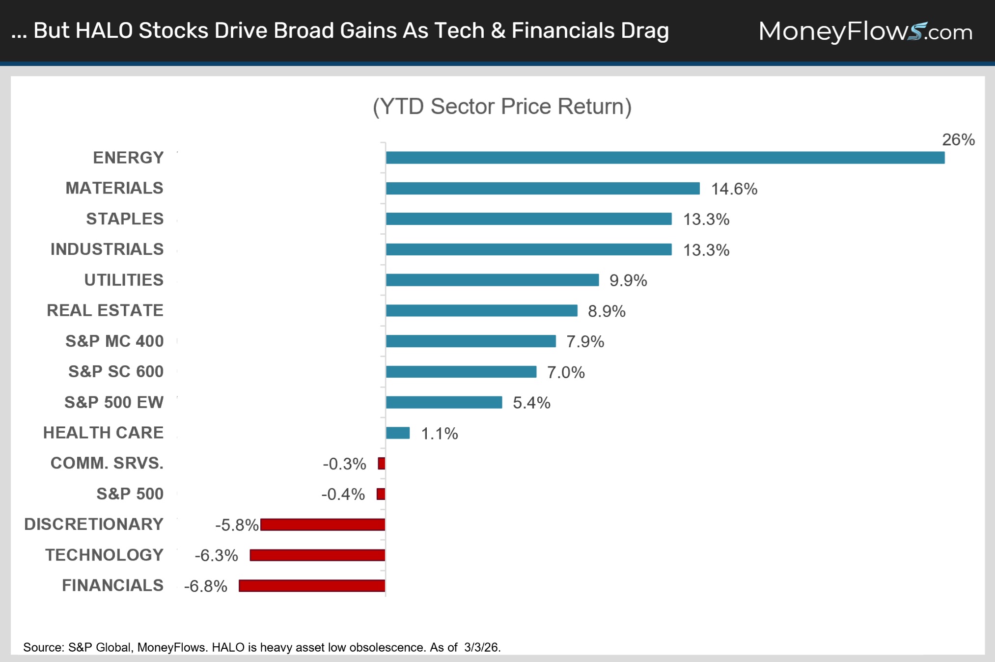 HALO heavy sectors like energy, materials, utilities, staples and industrials are all leading the market YTD by wide margins.