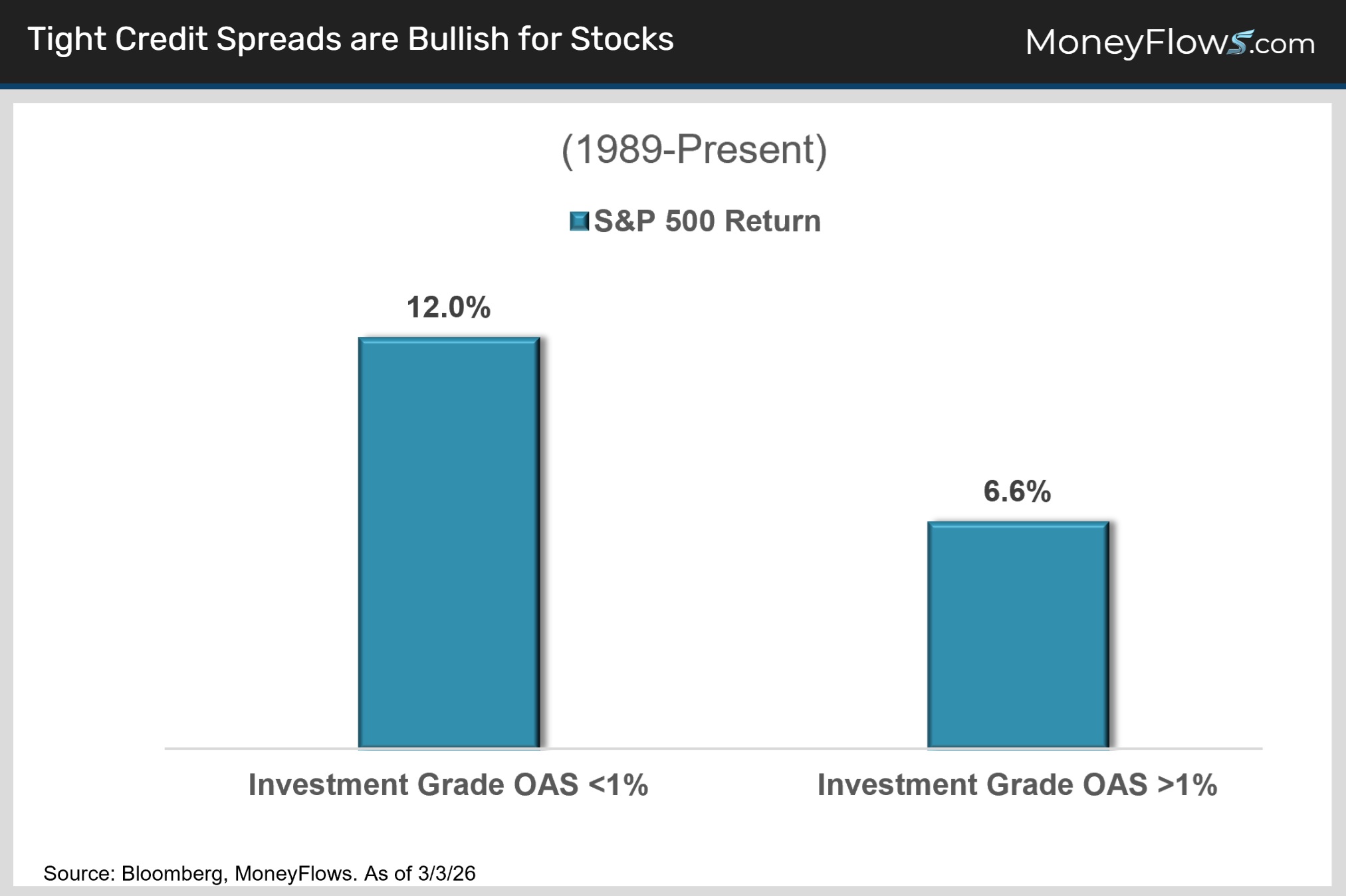 Here’s the best part. Stocks outperform when credit spreads are below 1%. This makes sense because super tight spreads reflect bond investors’ high confidence in the health of corporate America.