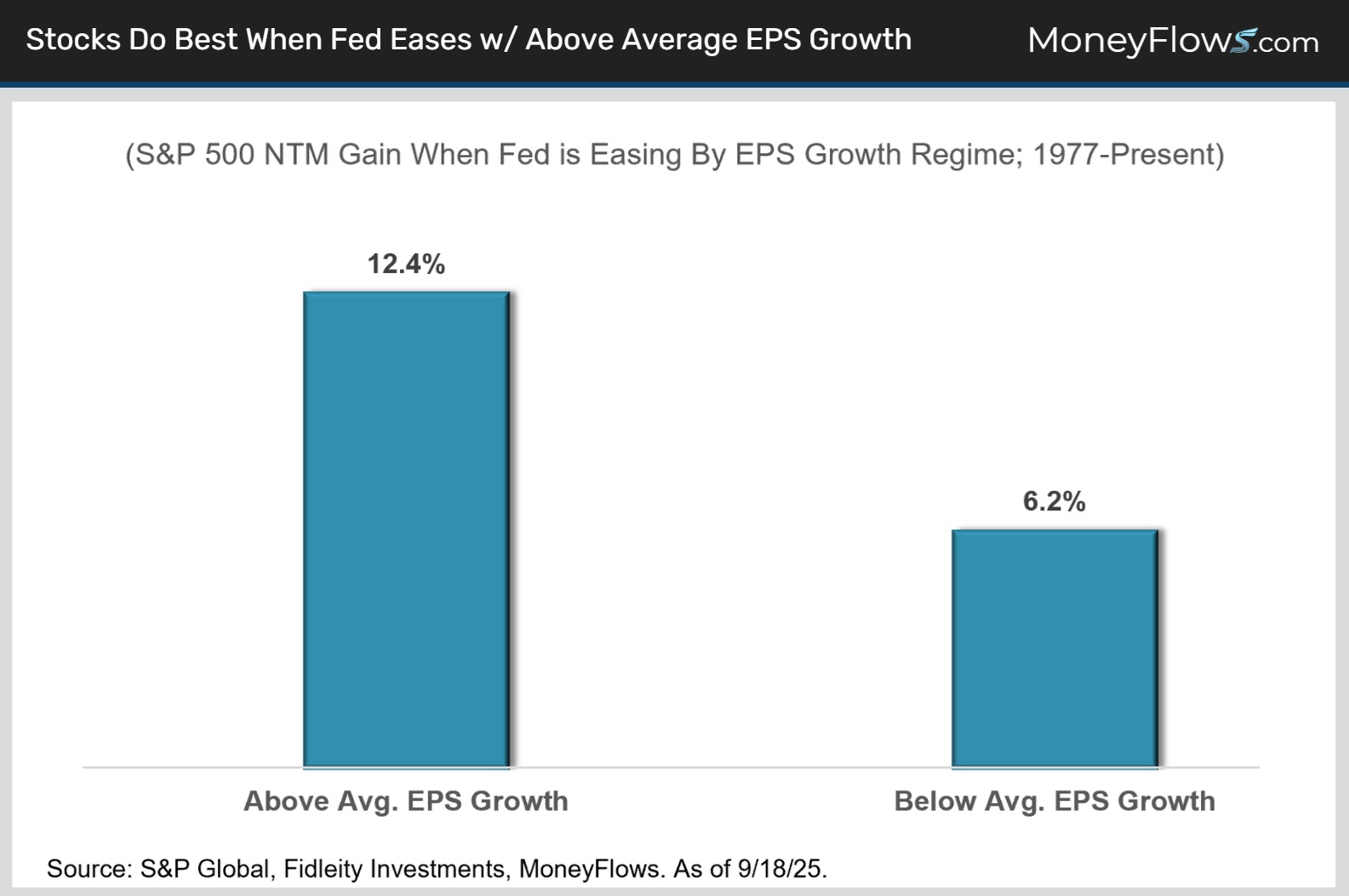 Since 1977, when the Fed is easing and earnings growth is above average, the S&P 500 gains an average 12.4% per year vs. only half as much during rate cutting cycles with below average profit growth: