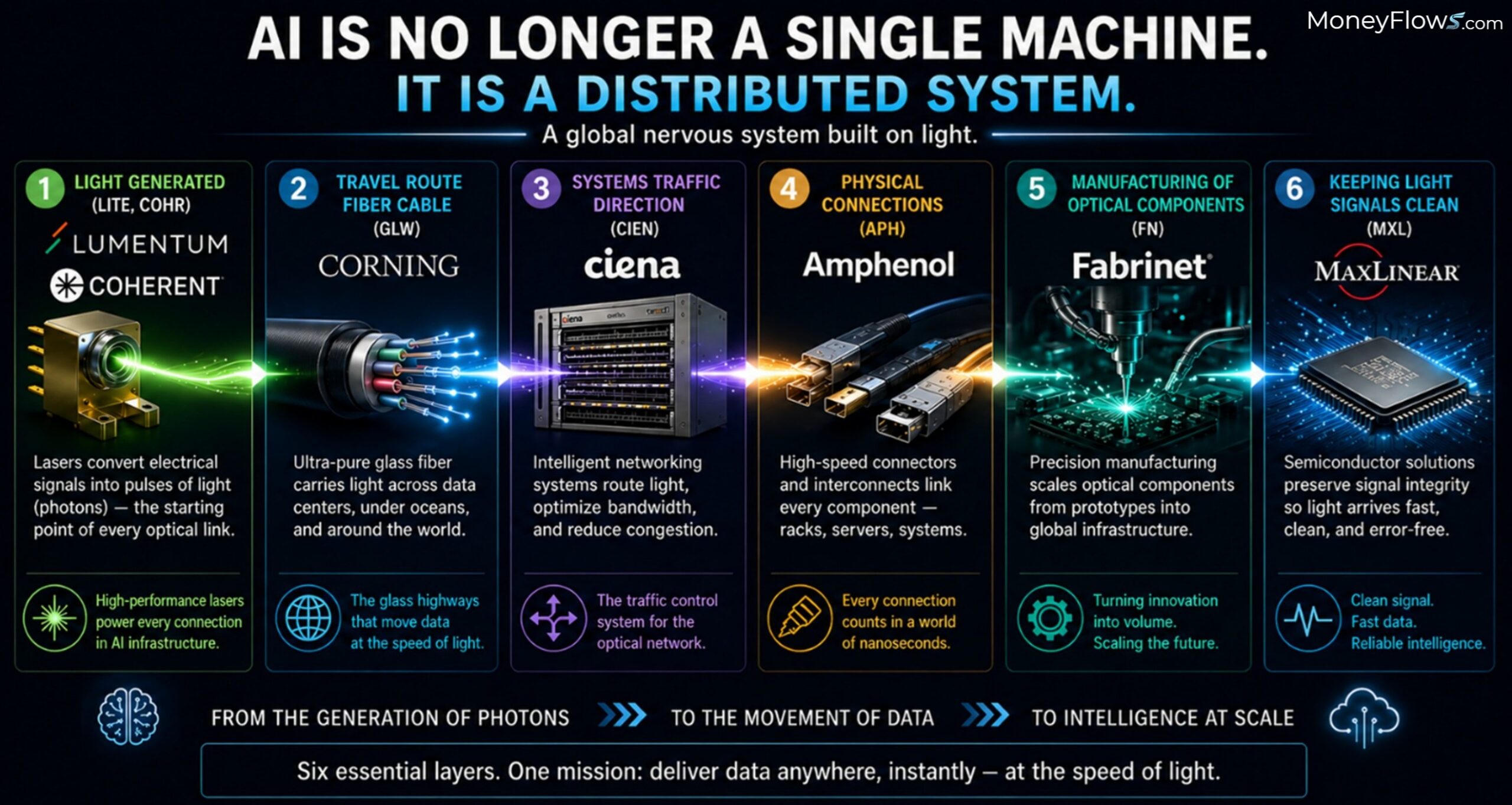 Now you can see that the solution isn’t just faster chips. It’s faster systems. Fiber optics and photonics have moved to the center of the AI story because they determine how efficiently data moves. The constraint has shifted from compute to communication.