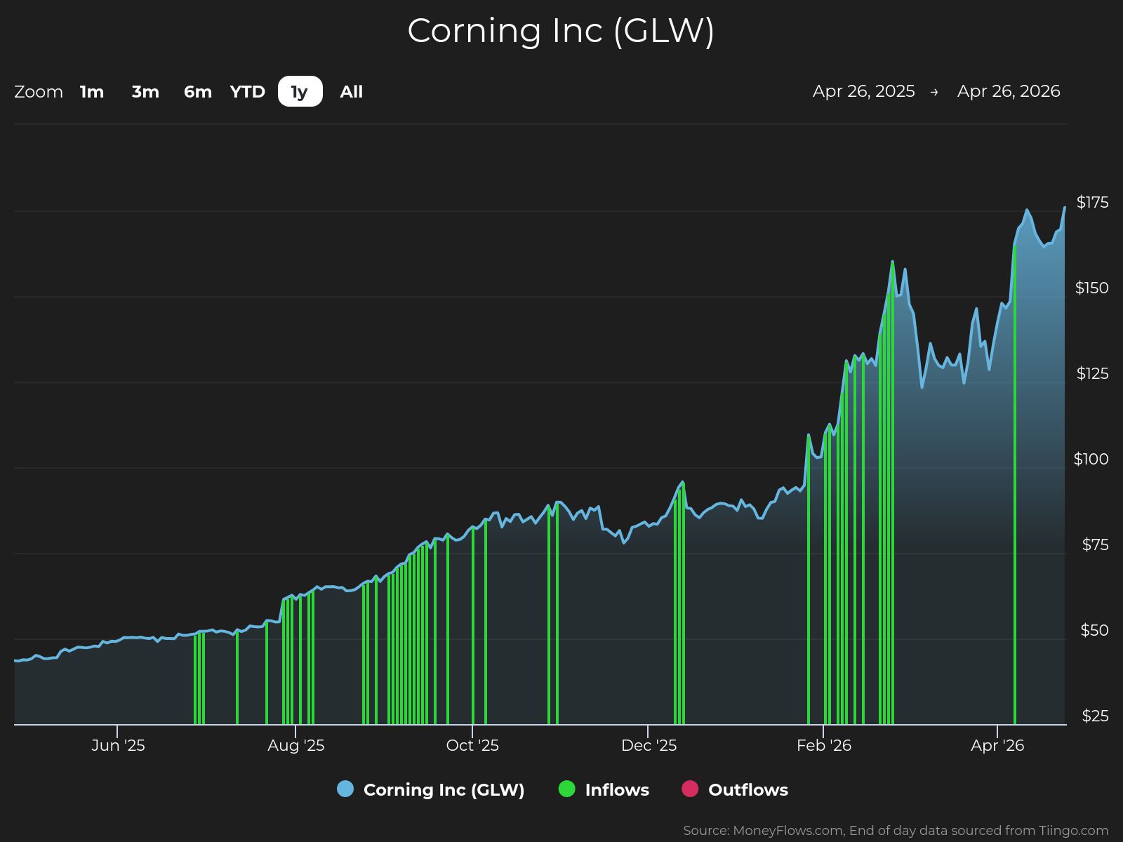 Once generated, light needs a path. Corning Inc. (GLW) manufactures the fiber optic cables that carry data across servers, data centers, and continents.