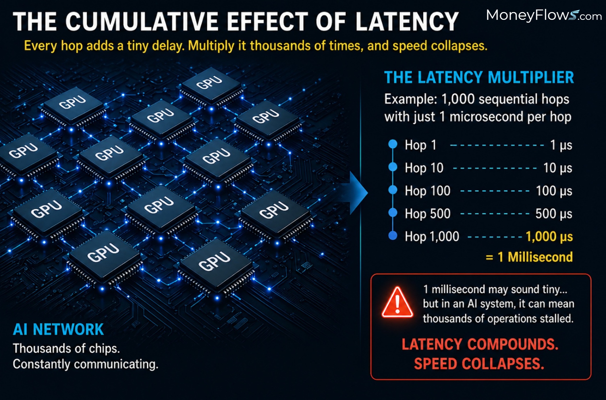 In everyday life, it’s barely noticeable, like a video that takes a moment to load. Inside AI systems, those delays compound. Thousands of chips must wait on each other. A single small delay ripples across the entire system. Milliseconds turn into microseconds, then nanoseconds.